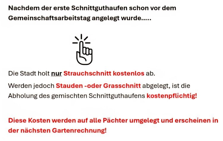Heute, am 05. April, haben wir unsere erste Gemeinschaftsarbeit in diesem Jahr mit den Pächtern der Gärten 51-100 durchgeführt. Ein riesiges Dankeschön an alle, die dabei waren – die Beteiligung war wirklich klasse! Wir freuen uns auch, dass ein paar unserer Fördermitglieder mit angepackt haben. Nach der Arbeit gab es wie gewohnt eine gemütliche Runde, in der wir uns bei Schweinebraten, Schnitzel oder Bärlauchpasta und Getränken über die neuesten Gartenprojekte in der "GartenOase" austauschen konnten. Es war ein schöner Tag, und wir freuen uns schon auf die nächsten Aktionen!